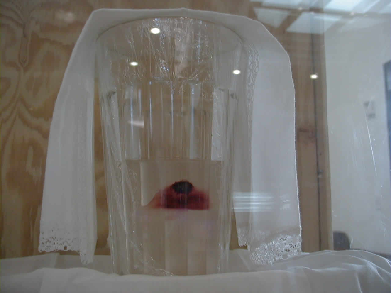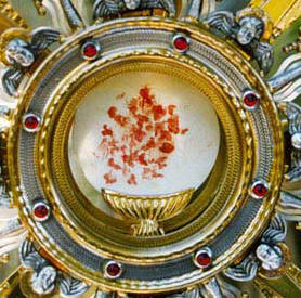 "My family and I just returned from the church. The Bishop has been out of town and unavailable. The custodian from the church told us the story in broken English. It seems that about thirty days ago during Communion, a young boy received the host. For some reason he did not swallow it, but spit it out on the floor of the bathroom. The priest followed him and picked the precious Sacred Host up from the floor. The priest placed it in water to dissolve it. After thirty days the host had still not dissolved, so he added more water and the Sacred Host moved from the side of the container to the middle and immediately became bloody flesh. It is on display, but not many people know about it yet. While we were there there were a few nuns and a priest who came to venerate the 'Eucharistic Miracle.'"