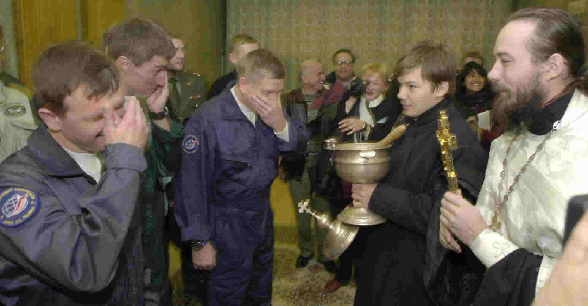 Meanwhile -- if only partially -- Russia has seen a remarkable trend back toward Christianity, with the Orthodox Church surging into public view (in such a way that cosmonauts are blessed by a Patriarch, below, left, before lift-off, something that would never happen in the U.S. One cosmonaut has revealed that when he went into space, he had a Cross in his pocket all along that an aunt gave him for protection.]